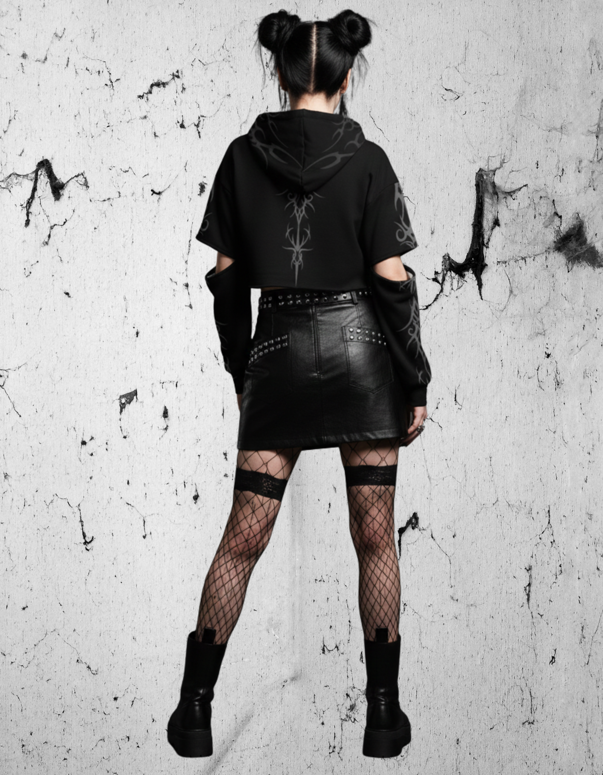 This fashionable hoodie is the epitome of dark streetwear. Wear it with a studded mini skirt (as pictured), wide-leg cargo trousers, or high-waisted grunge jeans. Thanks to the cropped hemline and the sleeve cut-outs adorned with tribal gothic prints, it's ideal for layered styling. Pair it with fishnets, platform boots, and a heavy choker to create a complete cyber-goth or punk-goth look. A perfect choice for fans of alternative tops and unique hoodies.