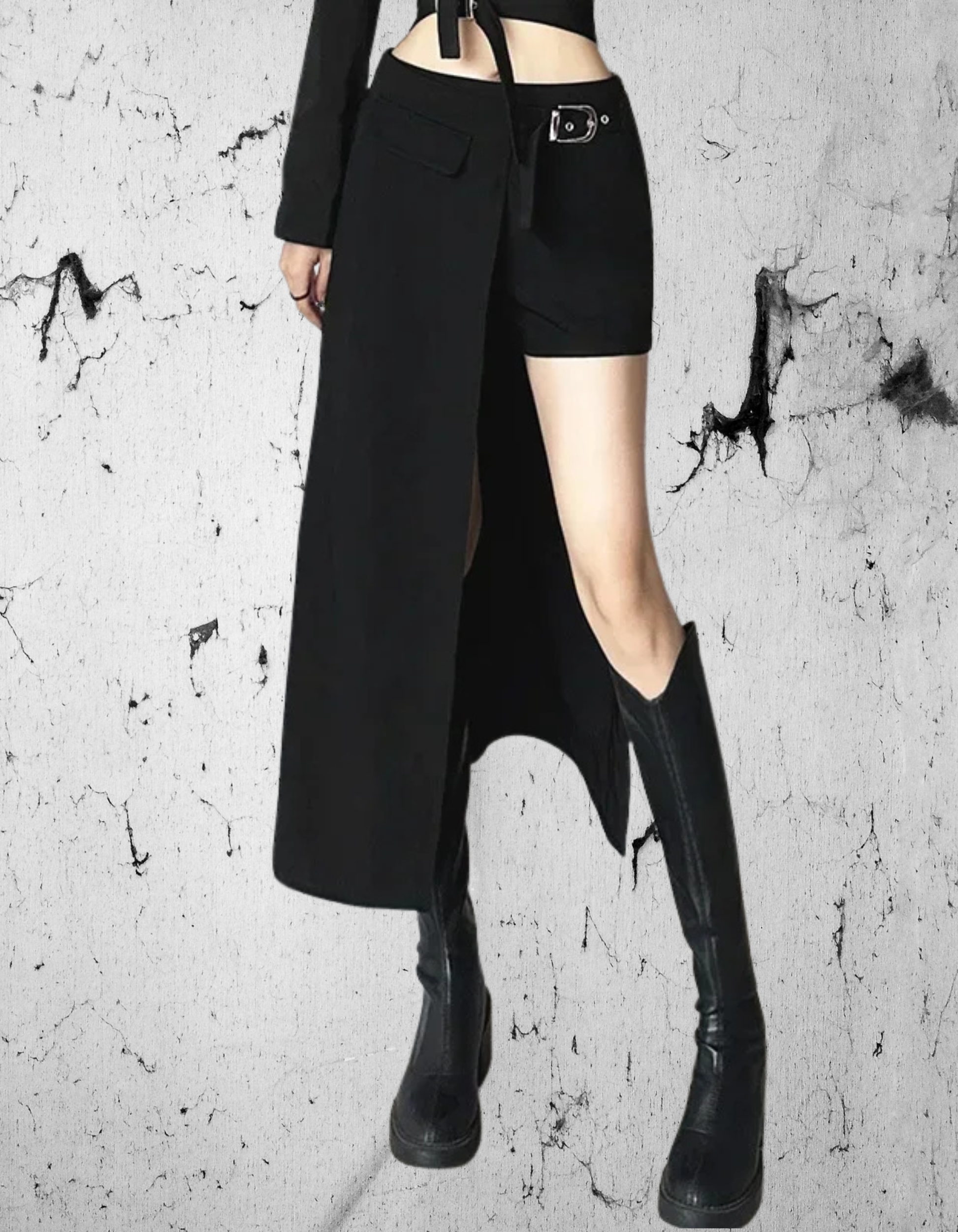 Wykonana z wysokogatunkowego poliestru, tkanina posiada delikatny połysk i doskonałą strukturę, która zachowuje formę przy każdym ruchu. Asymetryczne cięcia nadają sylwetce dynamiki, a wysoki stan i pasek z klamrą subtelnie podkreślają talię, nadając całości futurystyczno-gotycki vibe. To ubranie dla tych, którzy nie idą utartym szlakiem — to manifest indywidualizmu.