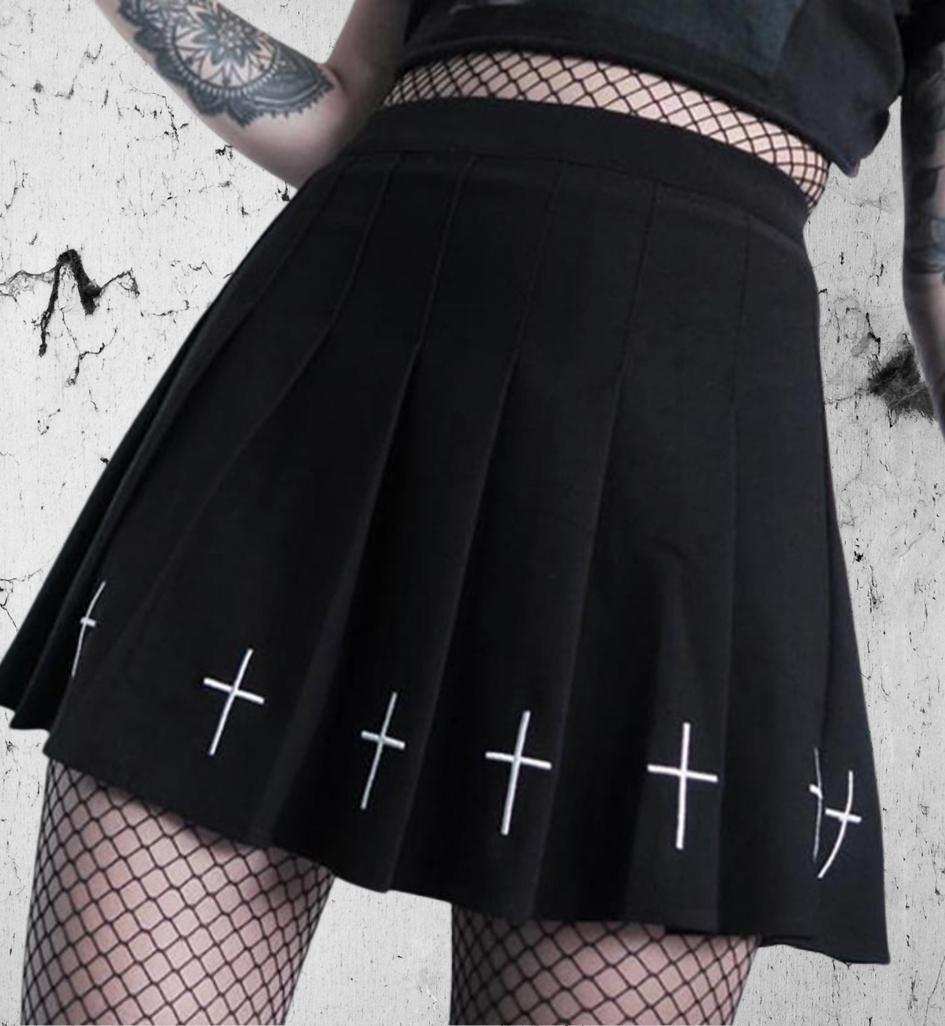 Ta spódniczka z haftowanymi krzyżami to idealny wybór dla fanek stylu gothic, dark academia, grunge i alternative fashion. Doskonale komponuje się z: