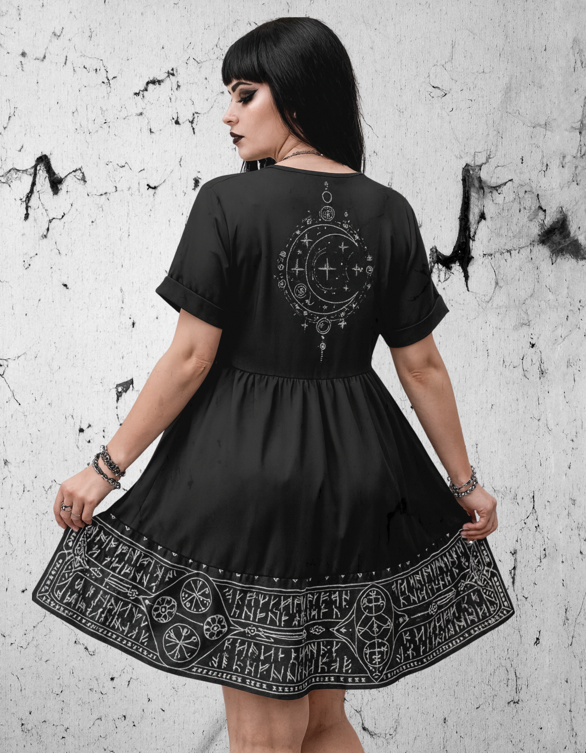 Przód zdobi głęboki dekolt w kształcie litery V z ozdobnym wykończeniem, a dół sukienki otaczają ezoteryczne runy i symbole magiczne. Tył to prawdziwe dzieło sztuki – duży nadruk mistycznego księżyca i konstelacji, który sprawia, że każda stylizacja nabiera tajemniczego charakteru.