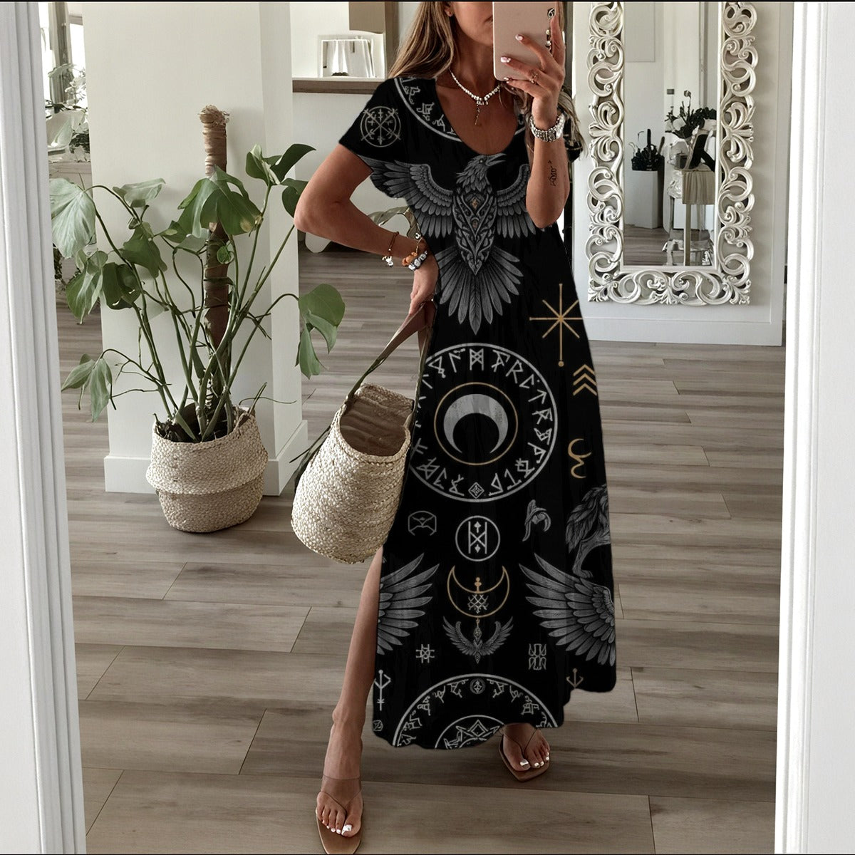 Wyobraź sobie, że idziesz przez festiwalową polanę – wokół tłum w casualowych stylizacjach, a Ty wyróżniasz się jak postać ze snu: tajemnicza, piękna, otoczona aurą mistycznego światła księżyca. Delikatny wiatr porusza materiałem, a nadruki run i skrzydeł kruka układają się w rytm Twojego kroku.