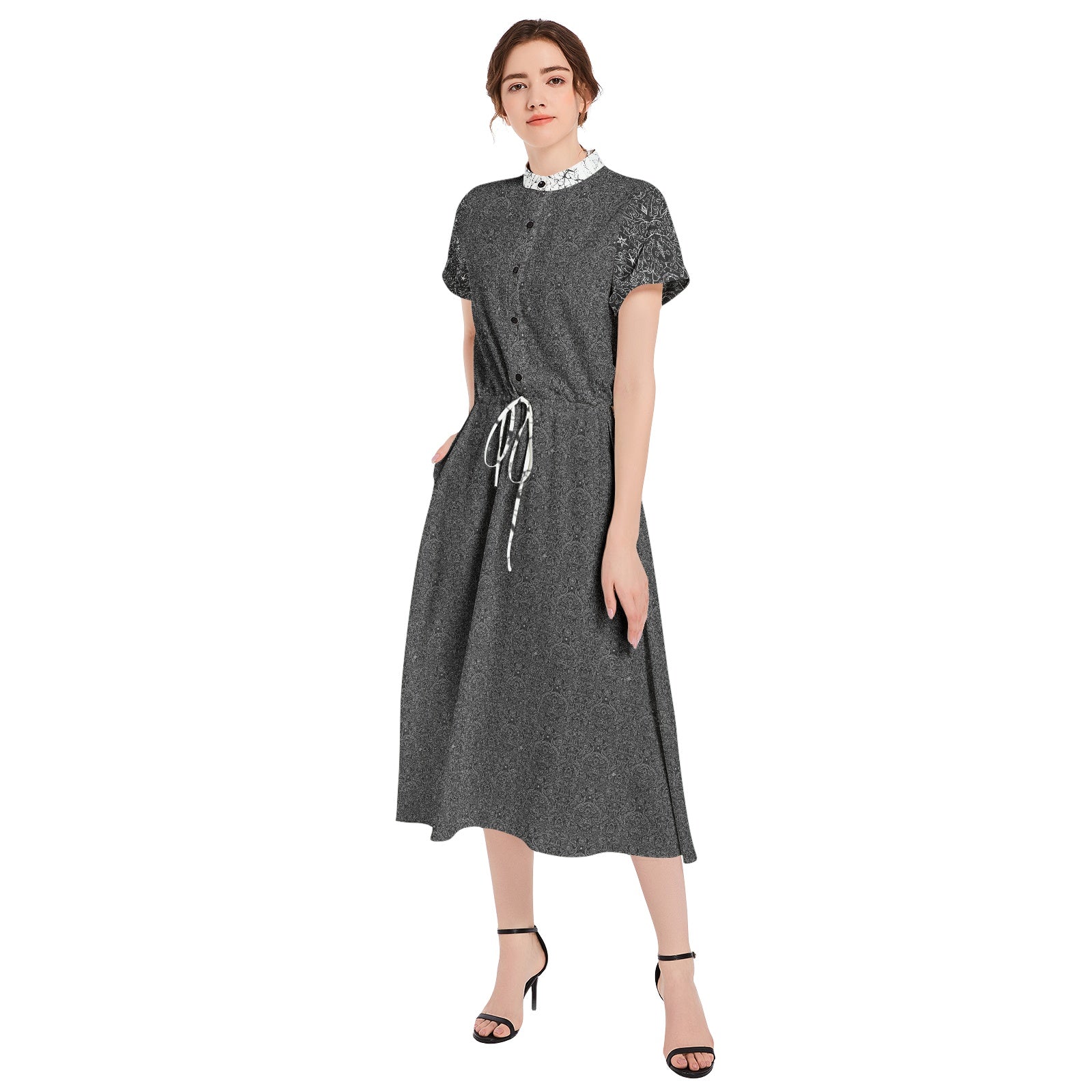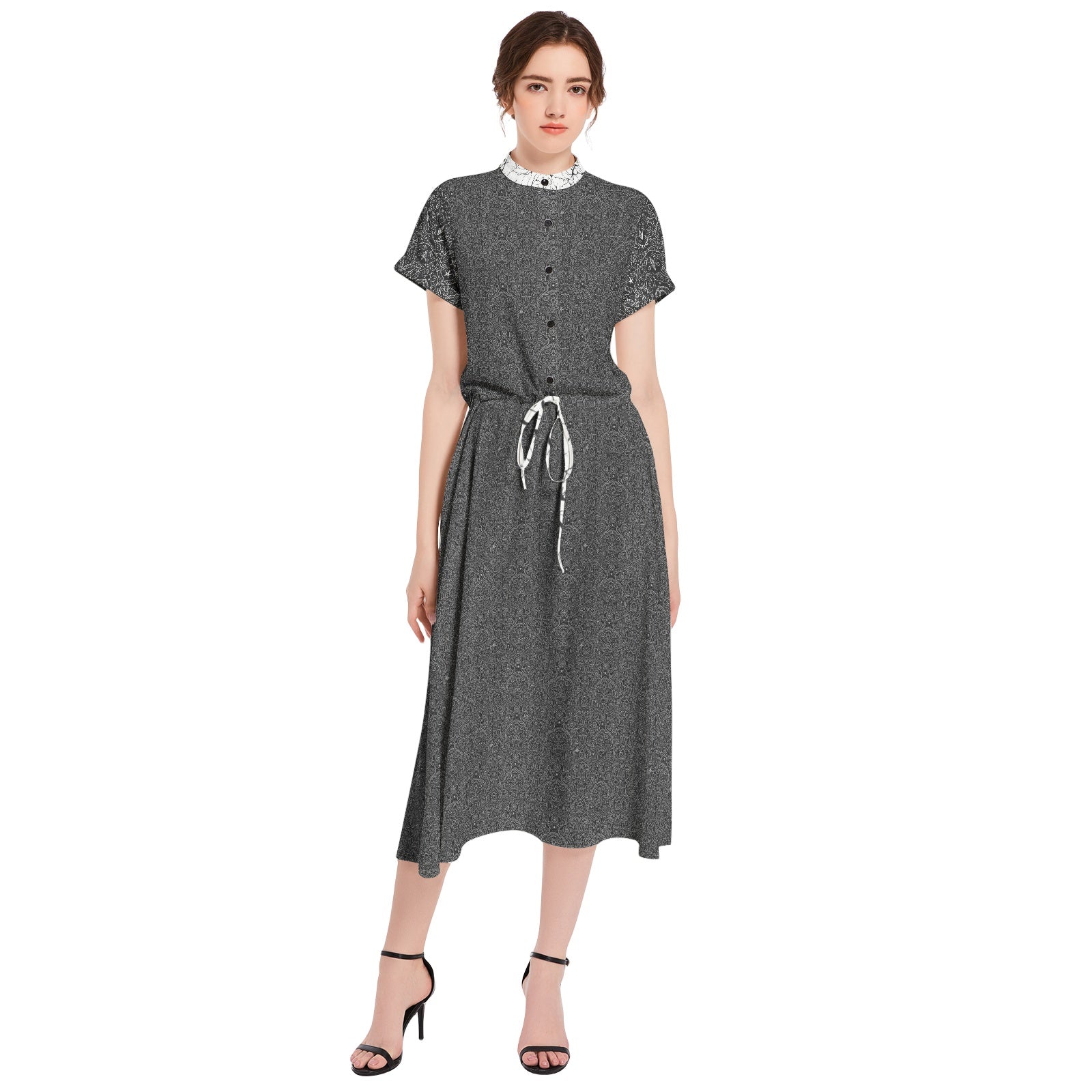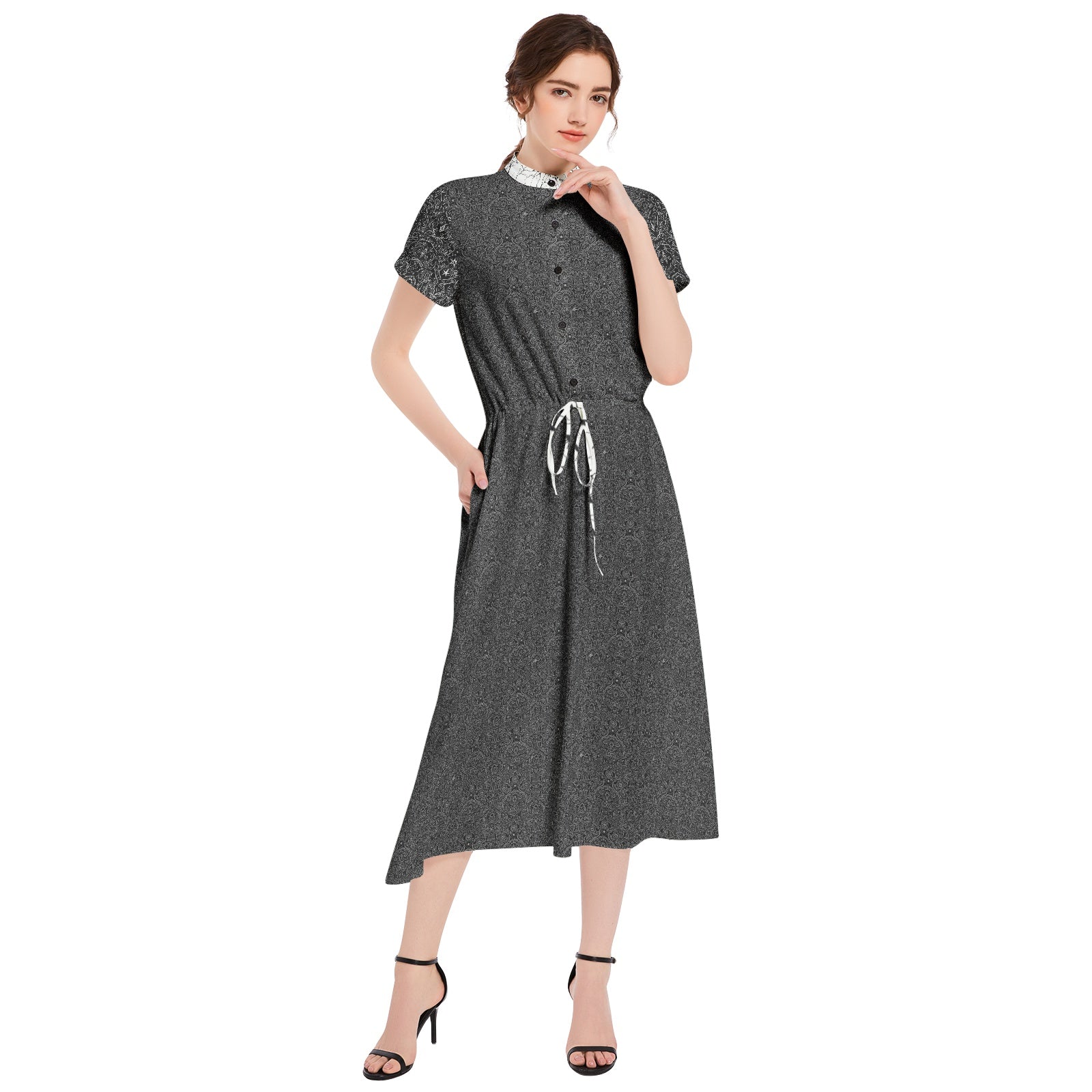 Zainspirowana estetyką dark vintage, ta sukienka zachwyca detalami: motylkowymi rękawami, ozdobnym kołnierzykiem i rozkloszowanym dołem, który nadaje sylwetce harmonii i elegancji. To połączenie delikatności i wyrafinowania, które idealnie wpisuje się w styl gotyckiego romantyzmu.