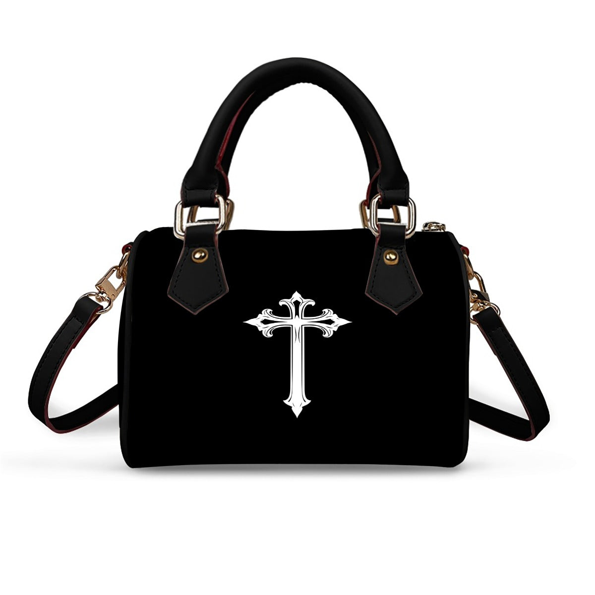 Ta gotycka torebka barrel-shaped to kwintesencja mrocznej elegancji – minimalistyczna forma uzupełniona wyjątkowymi detalami, które podkreślają charakter alternatywnego stylu. Z jednej strony widnieje napis “Dark Elegance” w dekoracyjnej czcionce, a z drugiej majestatyczny krzyż gotycki – symbol siły, mistycyzmu i ponadczasowej estetyki. To akcesorium, które od razu zwraca uwagę i staje się centrum Twojego outfitu.