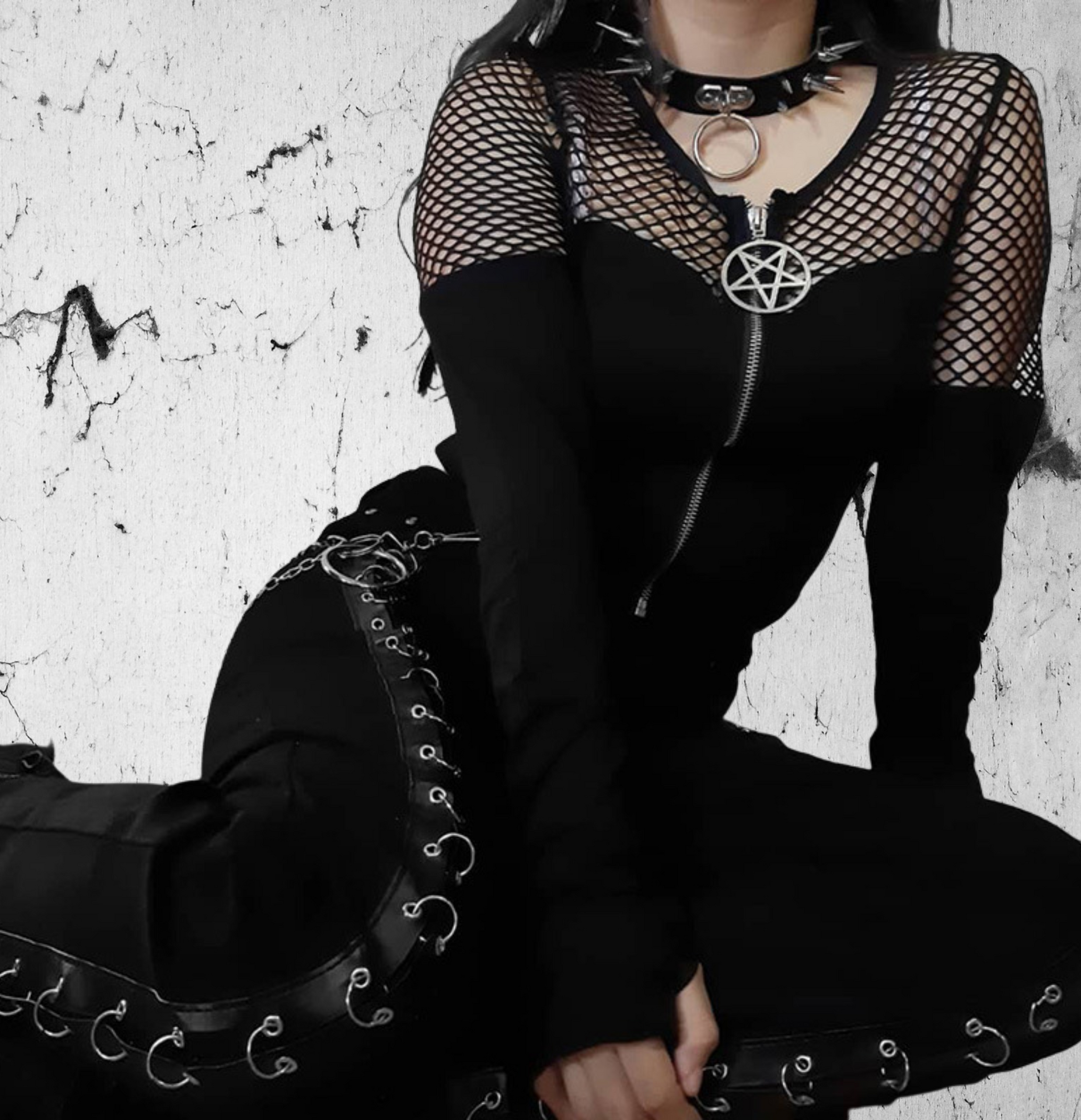 Detale: fishnet mesh, metalowy suwak, pentagram