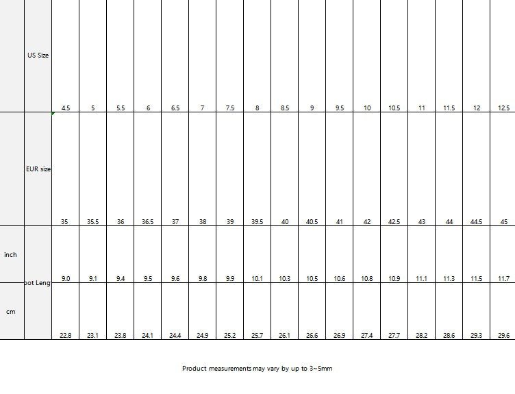 | EUR Size | US Size | Insole Length(inch) | Insole Length(mm) |