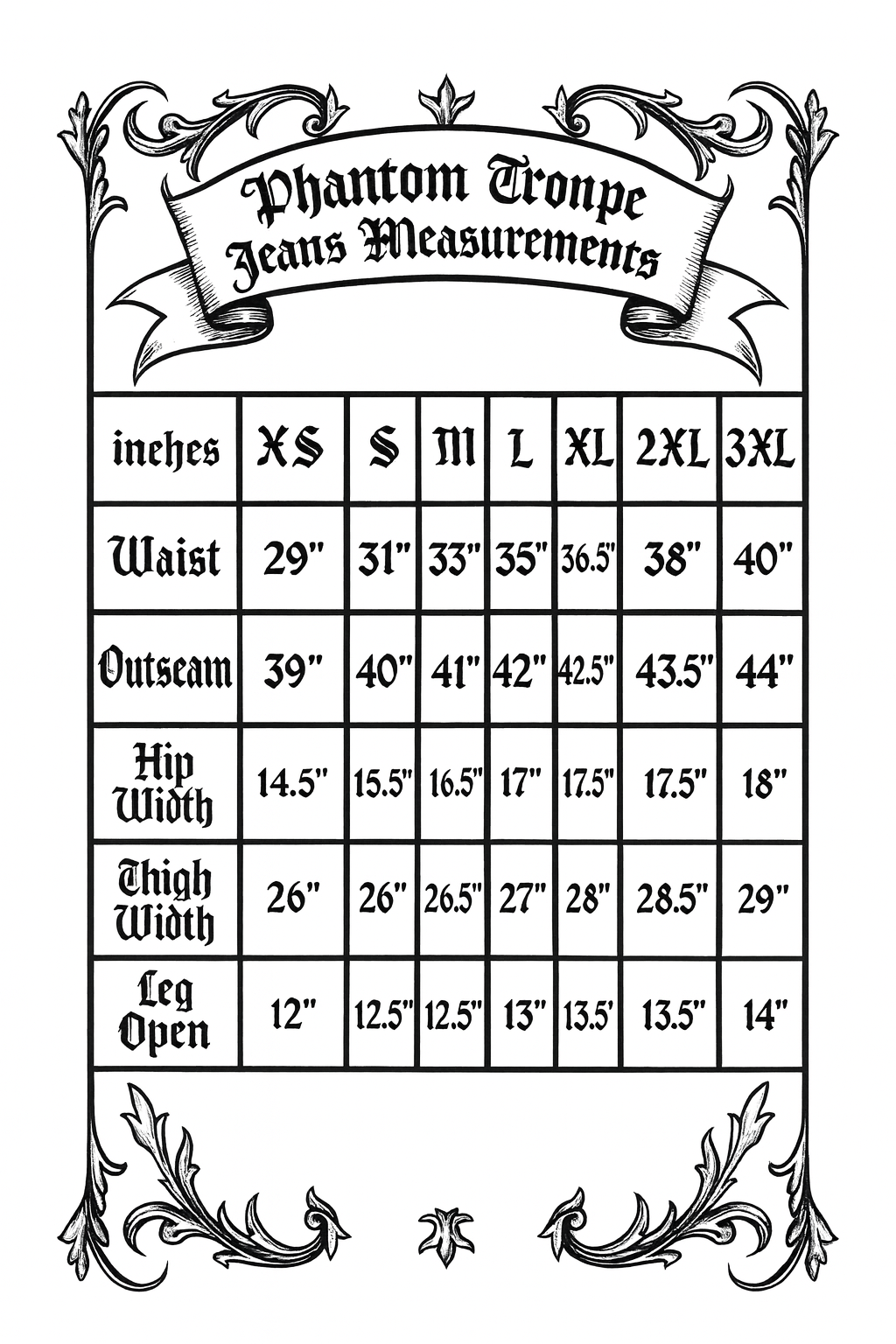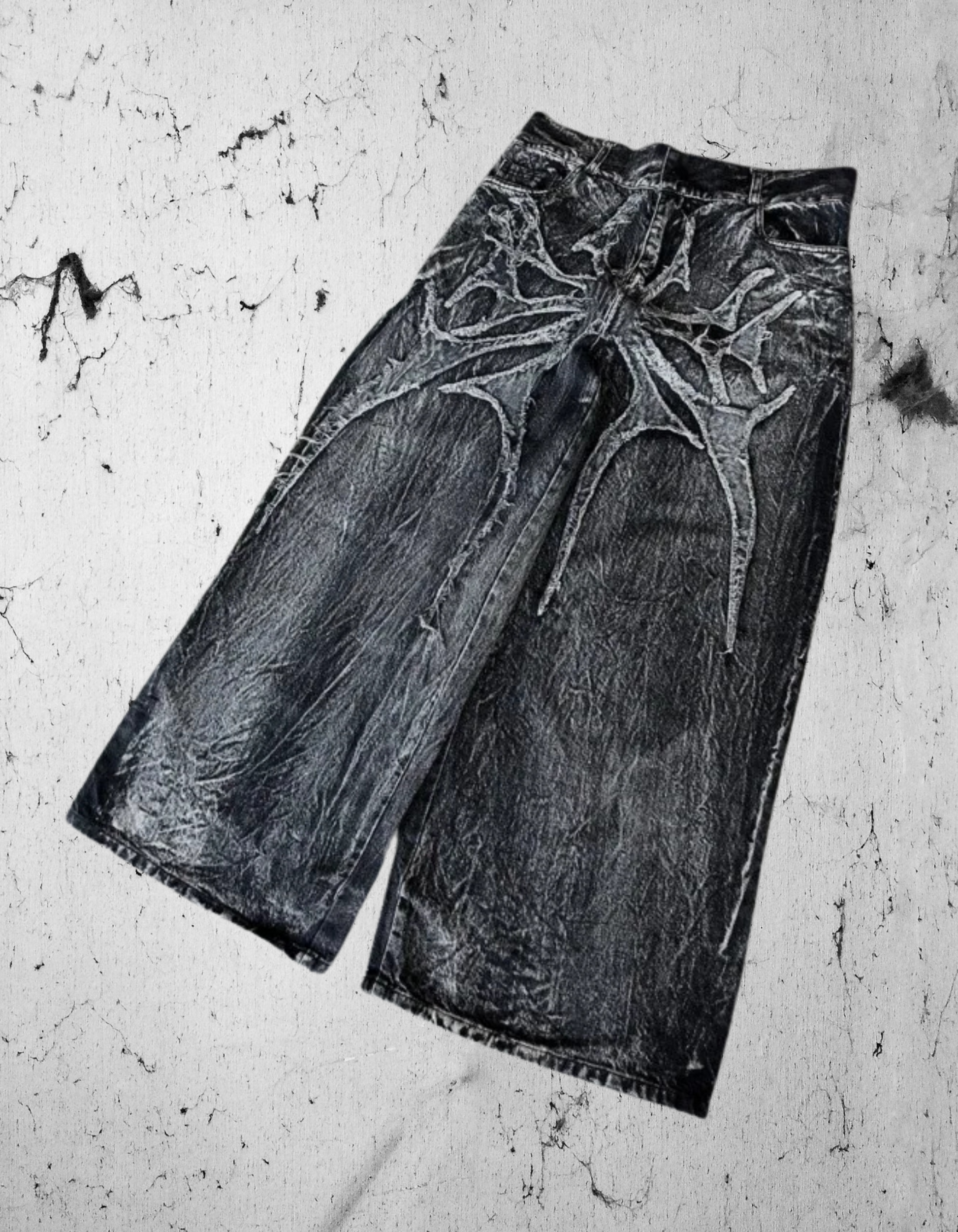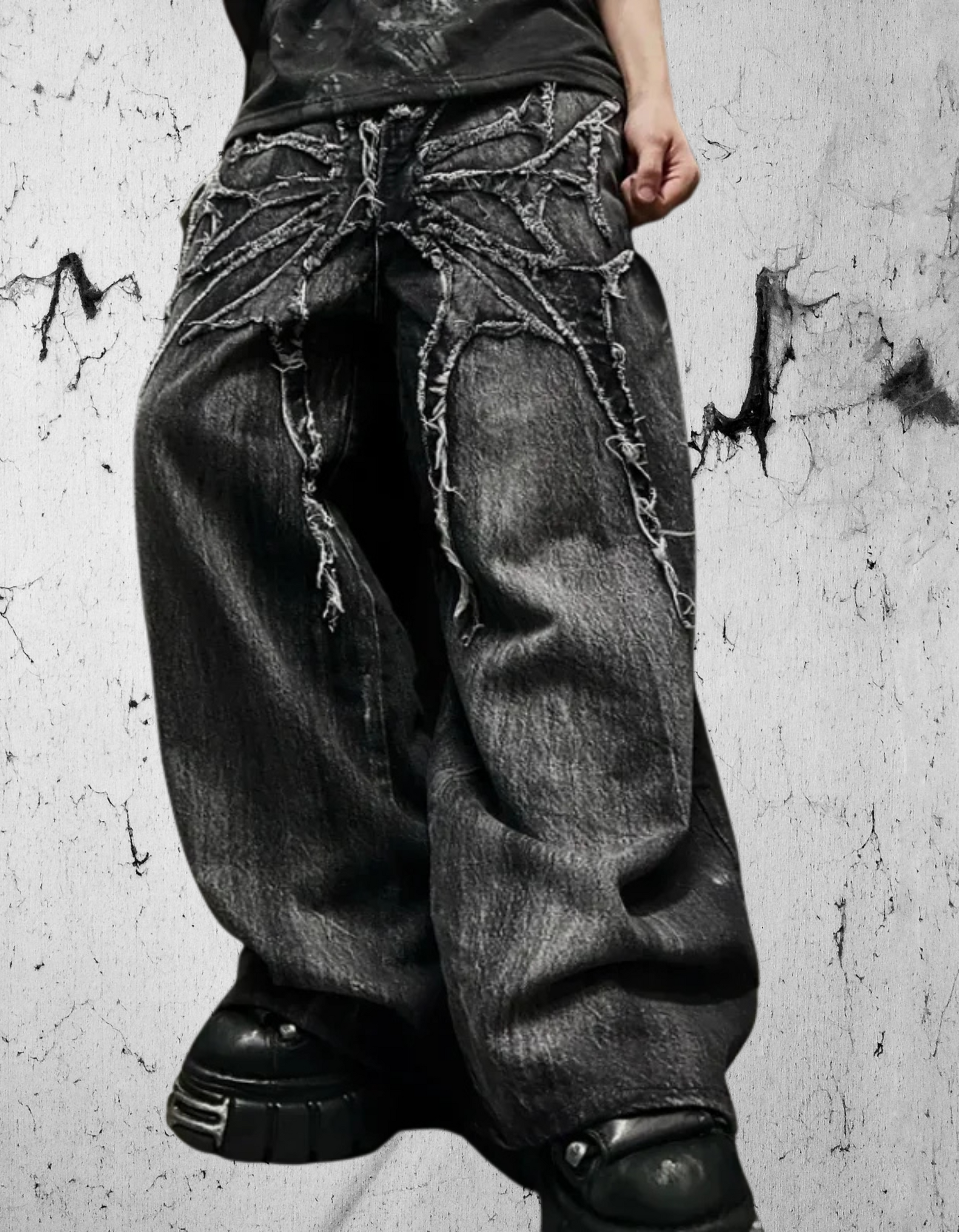 Gotycki styl spotyka streetwearowy charakter w tych unikatowych spodniach, które łączą surową estetykę goth z ponadczasową wytrzymałością 100% denimu. To spodnie stworzone dla tych, którzy chcą wyróżnić się odważnym i alternatywnym lookiem – wyraźnie podkreślając swoją niezależność i mroczny vibe.