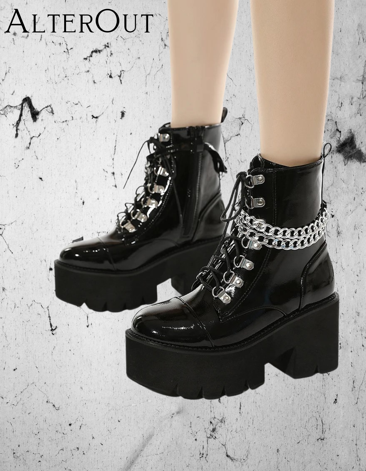 Sznurowanie i Detale: Z przodu botki są wyposażone w solidne sznurowanie, które pozwala na idealne dopasowanie do łydki. Metalowe oczka i masywne łańcuchy dopełniają całości, nadając butom surowego, industrialnego wyglądu.