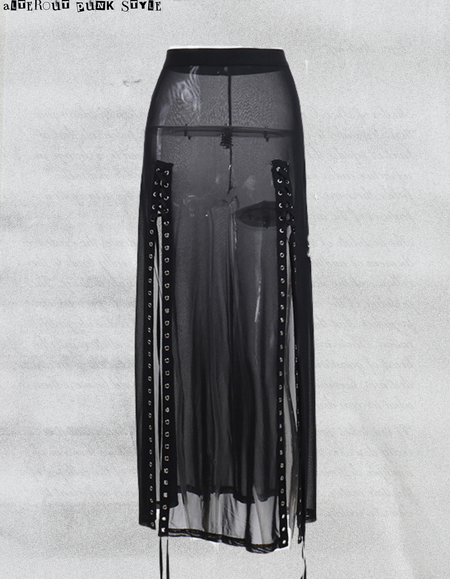 punk maxi skirt, spódnica gotycka, czarna spódnica przezroczysta, spódnica fetishwear, punkowa spódnica z oczkami, alt girl skirt, goth maxi skirt, spódnica rave, black mesh skirt, spódnica z wysokim rozcięciem, industrial fashion skirt, punk outfit skirt, czarna spódnica na koncert