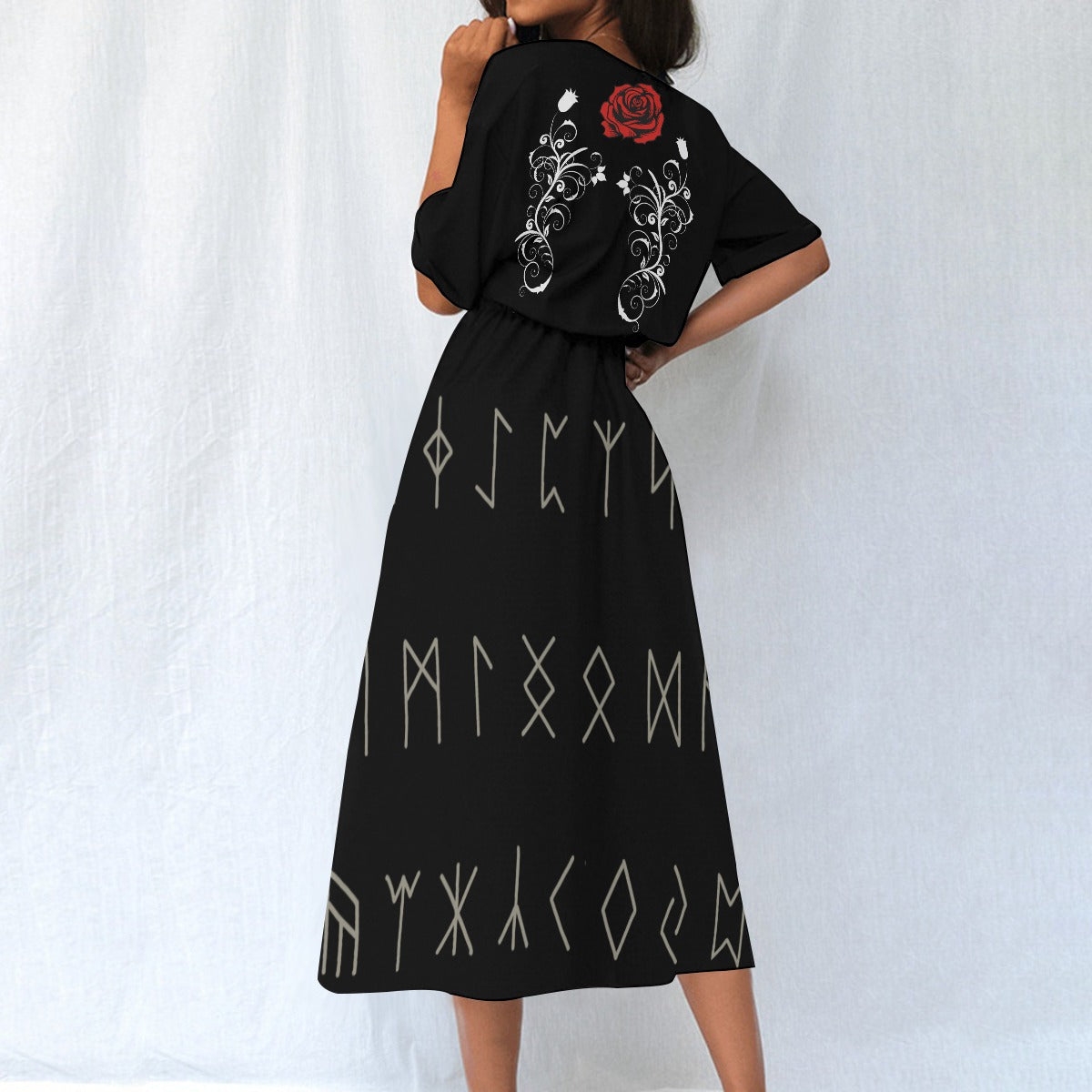 Cała spódnica sukienki jest pokryta mistycznymi runami, których znaczenie sięga głęboko w historię. Te pradawne symbole nie tylko dodają sukience unikalnego charakteru, ale również mają za zadanie chronić, wzmacniać intuicję i prowadzić przez meandry życia, czyniąc ją nie tylko elementem garderoby, ale prawdziwym amuletem.